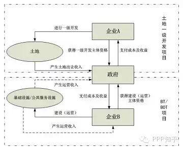 在上述土地财政模式的架构下,在某一区域范围内,一方面,企业通过政府授权程序取得一级开发主体资格后,在授权范围内进行土地一级开发,并根据与政府之间关于项目成本收益支付的约定(例如固定比例收益、土地出让净收益分成、固定收益加净收益分成、固定年化收益等模式)获得投资成本及收益,政府将经过一级开发整理后的土地在二级市场上进行出让,并获得土地出让收入;另一方面,该企业或另一企业通过政府授权程序取得区域范围内建设/运营基础设施/公共服务设施的主体资格后,在授权范围内进行基础设施/公共服务设施的建设/运营,通过运营产生的收入及/或与政府之间关于项目成本收益支付的约定获得投资成本及收益。
