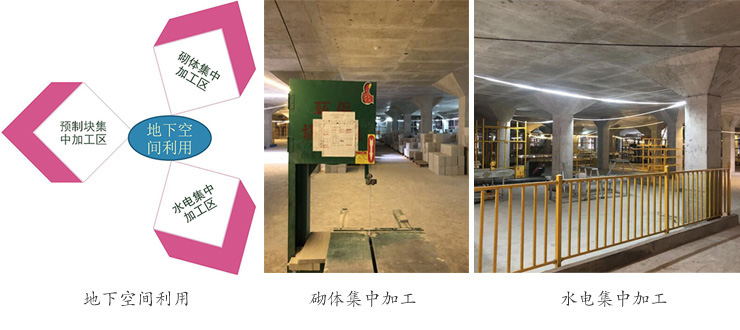 地下室空间利用。现场砌体、水电集中加工区布置在地下室,施工电梯垂直运输也同步下地下室,充分利用地下室空间,为市政先行大穿插提供便利。