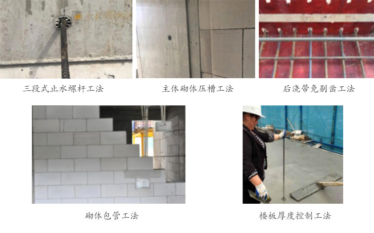 高效工法运用。项目采用1)地下室防水采用渗漏结晶;2)地下室无梁楼盖;3)铝模+全钢爬架;4)PC楼梯、空调板、阳台叠合板;5)全现浇外墙;6)自防水窗企口;7)构造柱随主体一次成型;8)厨卫间反坎一次成型;9)门洞一次成型;10)高精地坪;11)高精度加气块;12)界面剂薄抹灰;13)止水节精准预埋等40类高效做法提升施工质量和效率、实现一次成优。