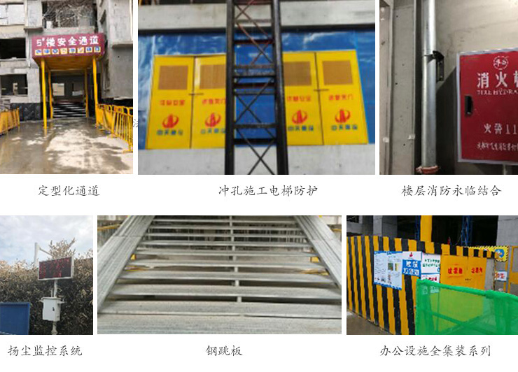 绿色施工。可周转安全定型化防护通道、定型化围栏,半个扣件临边防护,冲孔施工电梯防护,定型化钢板通道,楼层消防永临结合,洗泵废水再利用,PC预制、铝模、办公区生活区全系列采用集装箱等。