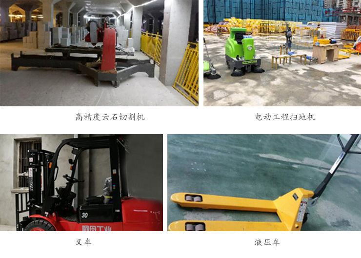 先进工具、机械。项目部采用先进工具和机械,提高生产力与安全文明施工。如:砌块云石切割机、砌块粉碎机、电动工程扫地机、叉车、大力车、水电预埋管线测堵仪、液压冲孔机等。