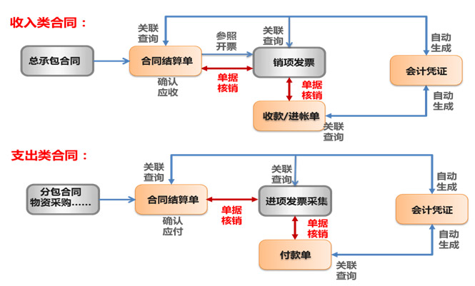 2、通过营改增信息化系统建设,辅助企业建立合同结算、开票、收票、收付款的一体化、规范化流程,强化流程中涉税控制点的管控,实现“合同”、“发票”、“资金”三流合一的全生命周期的合同管理;